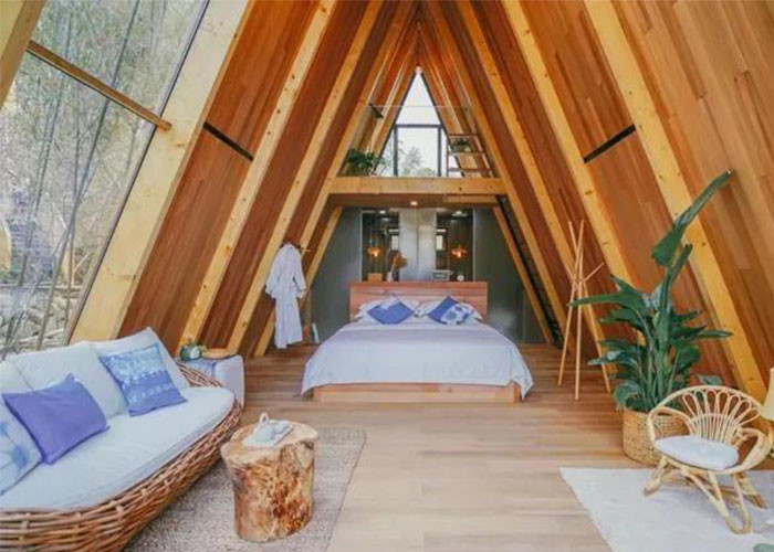 Ten trójkątny drewniany dom ma unikalny trójkątny kształt. Szklane okno sięgające od podłogi do sufitu sprawia, że całe pomieszczenie jest jasne i dobrze oświetlone. Na otwartym tarasie ustawiono stoły i krzesła, co jest idealnym miejscem do siedzenia po obiedzie, podziwiania widoków, rozmów i obserwowania gwiazd. Posiada kuchnię, łazienkę, sypialnię i salon. Ten rodzaj przestrzeni jest mały i praktyczny, co bardziej nadaje się do zakwaterowania i projektów hotelowych w turystycznych obszarach widokowych. Może być również wykonany jako dom prywatny.