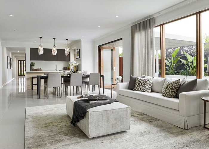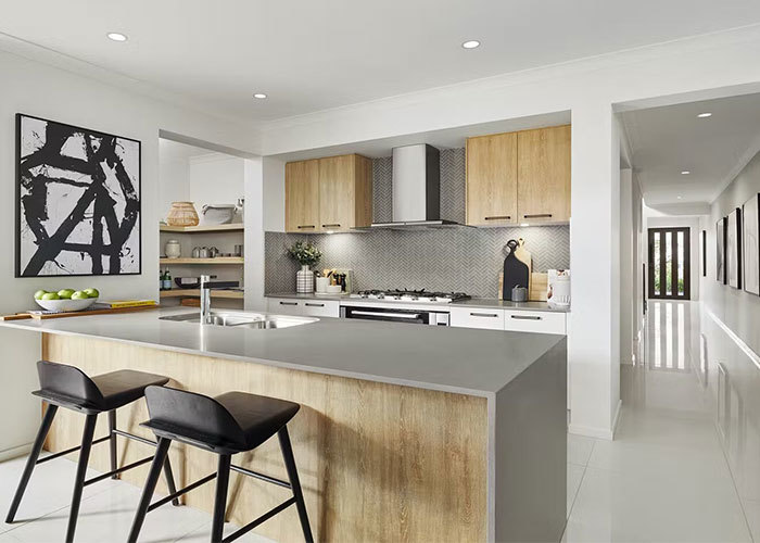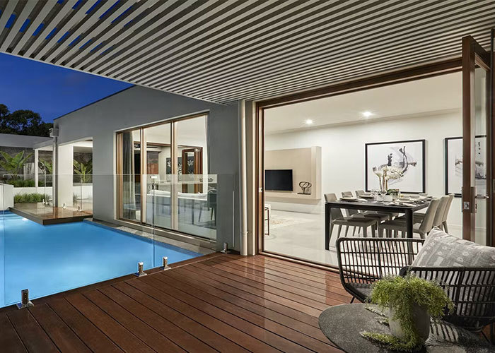 Środek domu otwiera się na otwartą kuchnię połączoną z jadalnią.z łatwym przepływem, który pasuje zarówno do codziennej rutyny, jak i spotkań z przyjaciółmi lub rodzinąZ jadalni duże aluminiowe drzwi przesuwne prowadzą bezpośrednio do pokoju zewnętrznego, rozszerzając przestrzeń mieszkalną na zewnątrz i tworząc płynne przejście między życiem wewnątrz i na zewnątrz.